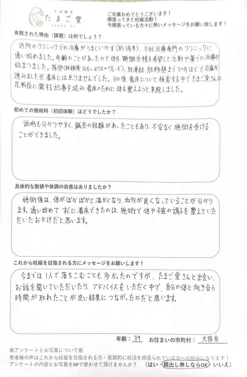 近所のクリニックでの治療がうまくいかず(約1年半)、不妊治療専門のクリニックに通い始めました。年齢のことがあったので体外、顕微受精を希望して注射や薬での治療が始まりました。採卵(妊娠率36%〜47%のグレード)、肝凍結、胚移植まで3ヶ月ほどで治療が進みましたが、着床には至りませんでした。その後、着床について検索する中でたまご堂さんの花粉症に関する記事を読み、着床のために体を整えようと来院しました。